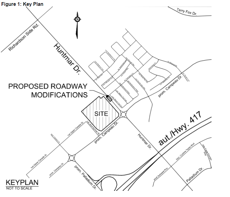 Construction work for roadway modifications to Huntmar Drive as part of an industrial development at 405 Huntmar Drive is commencing this Spring. The proposed modifications will take place on Huntmar Drive between 120m north of Campeau Drive and 270m north of Campeau Drive. This development will construct two, single storey light industrial buildings.