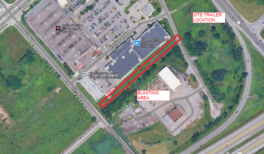 R.W. Tomlinson & M-Roc are going to be doing some blasting work in the trench between the MTO and Dymon Storage to facilitate the installation of new storm sewers below the existing rock elevation.