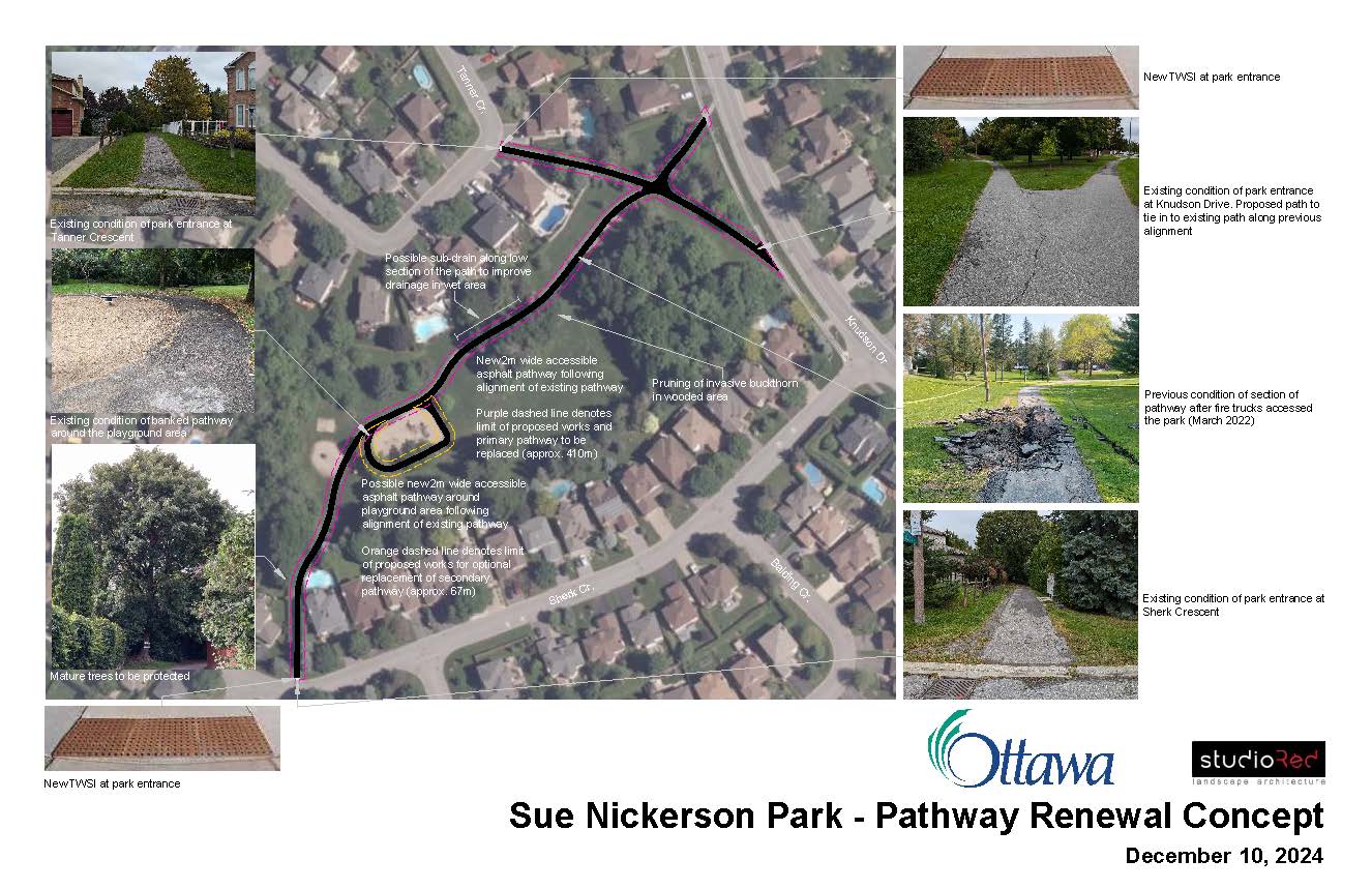 Sue Nickerson Park: Lifecycle renewal of the pathways within the park is set to commence mid-July. We can anticipate the crew actively working on site at that park for 4-5 weeks, wrapping up by the end of August. Please see the below concept plan for reference. They plan to stage the work in two phases: