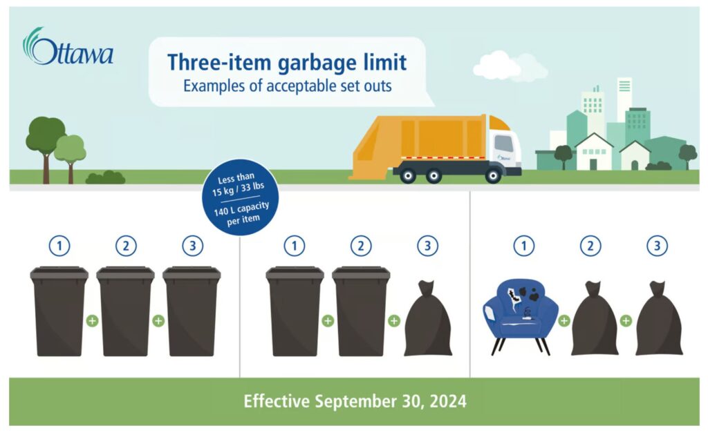 Starting Monday, September 30, the City will be implementing a three-item garbage limit for residents who receive curbside waste collection. This limit includes residents whose waste is collected in one shared location – often called a common pad – and those living on agricultural properties.